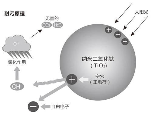 由機(jī)硅改性無機(jī)高分子合成樹脂和特種添加劑組成的水性罩面涂料,該產(chǎn)品有很強(qiáng)的光觸媒效應(yīng),涂膜吸收陽光的紫外線后,使表面達(dá)到超親水性,可分解涂膜面污物,具有自潔功能